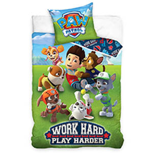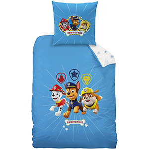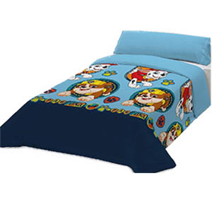 En tonos azules con la imágen de los cachorros de la Paw Patrol y huellas os presentamos este fantástico edredon de La Patrulla Canina.